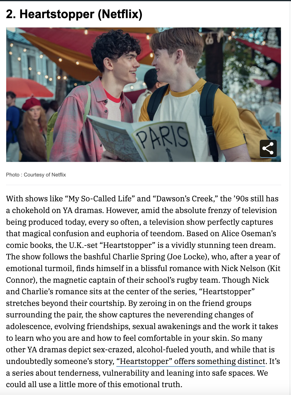 "Heartstopper" offers something distinct. It's a series about tenderness, vulnerability and leaning into safe spaces. We could all use a little more of this emotional truth.”